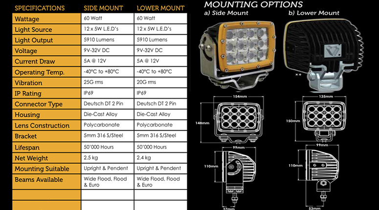 The all new DURA VISION Enforcer 12 x 5W L.E.D. lamp, offers the very latest, high powered L.E.D technology, ideal for use on heavy duty mining vehicles. Superbly compact, exceptionally tough, offering a substantial 145 degrees of adjustment, ensures you that the new Enforcer work lamp provides your solution to the most demanding applications. The Enforcer features revolutionary high output optics, that produce optimum light levels, along with the utilization of high quality Cree XP-G L.E.Ds controlled by Electronic Thermal Control.