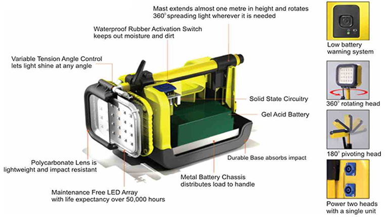 The 9430 is the perfect unit for hard to reach places. At just 10kg, the 9430 is easily transported up stairs or ladders, confined spaces. Its compact size and fully extendable mast with 360 degree rotating lighthead make tight spaces easily accessible. 12v charge port available for additional charging. Solid state high efficiency circuitry withstands rigorous industrial use day in and day out.