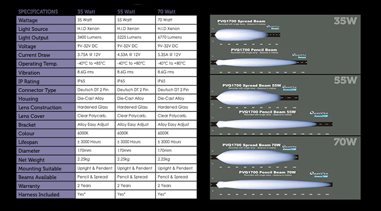 profile enabling them to be fitted on those hard to fit bull bars. Their die-cast alloy body and polycarbonate lens cover makes them extremely durable and perfect for use in harsh environments. The Quattro Alloy 1700 is available in 35W, 55W & 70W H.I.D Xenon option. They come with the ballast mounted internally and feature plug and play waterproof connections. All Quattro H.I.D Xenon lamps come with 1 complete wiring harness for every pair of lamps.